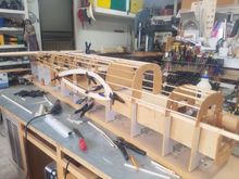 Fuselage in jig with center section. Thank goodness for the jig to keep it straight and true.