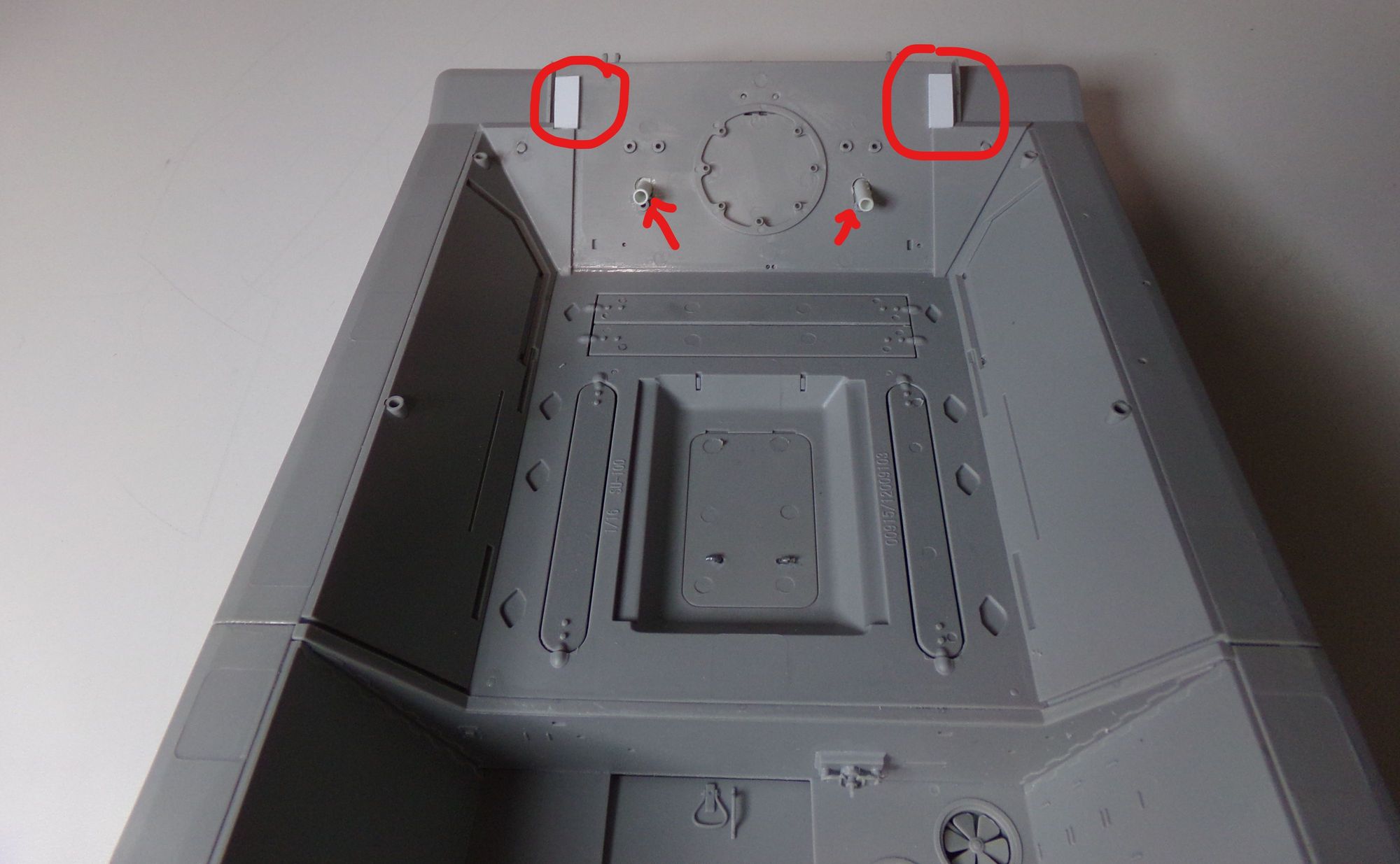 Styrene added to the rear upper to stop the rear side to side slop. Arrows show the ports added to the rear exhaust for a smoker later if desired.