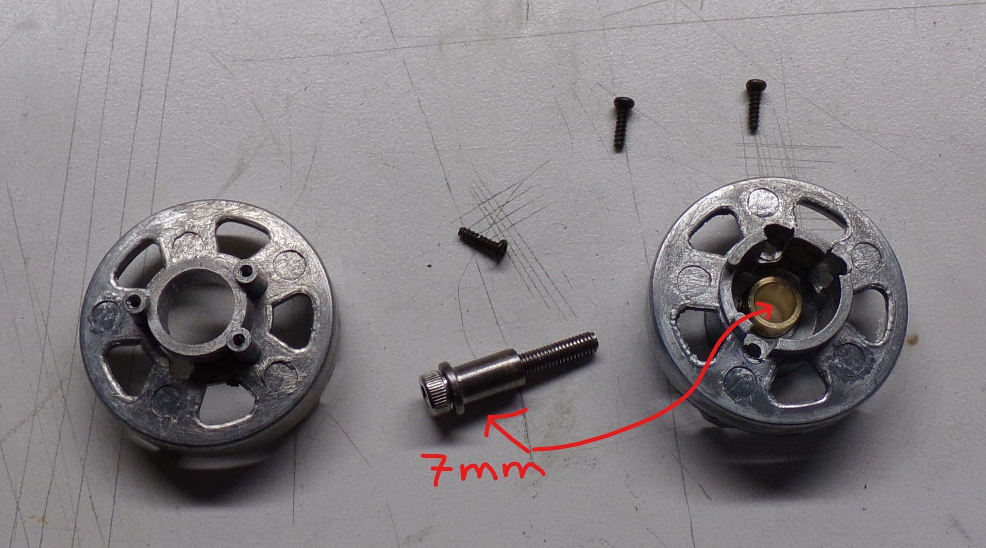 Bushing installed in the metal idler. Bushing needed to be bored to 7mm to accept the new idler shaft.