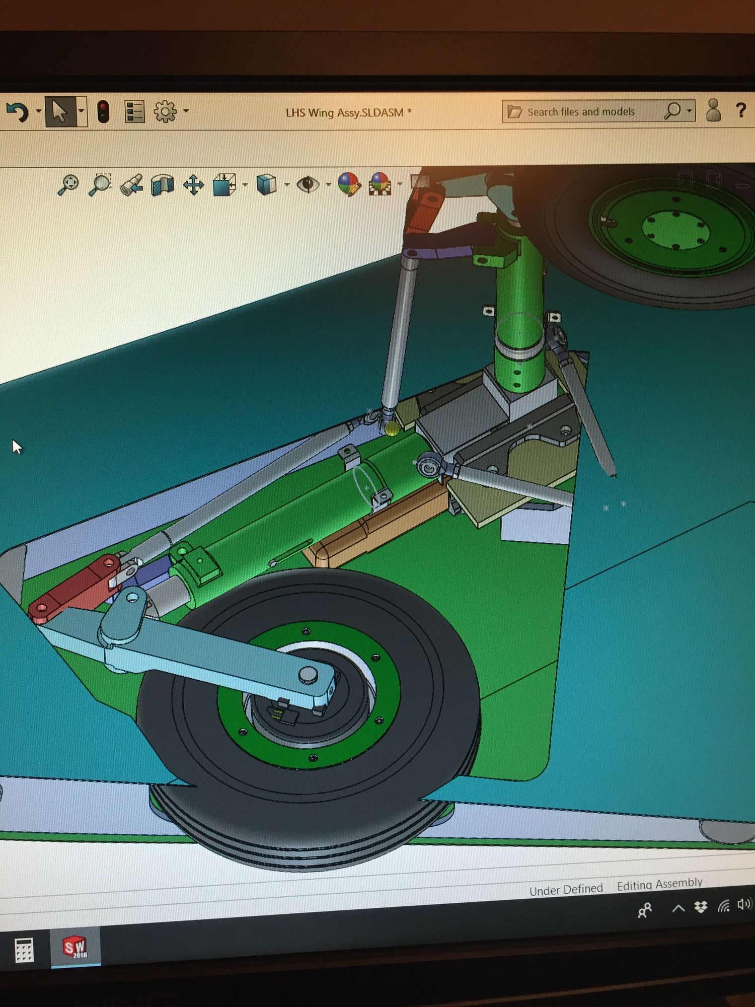 Prelim layout of the MLG. Electron EV-50s installed. The strut and wheel can fit into the MLG bay if I rotate the strut about its centerline axis. A yaw arm was added to do this. If I don't do this, commercial retract unit would not be usable - because the swing angle of the strut is angled in the planform and side views. the retract unit would be poking thru the top of the wing.