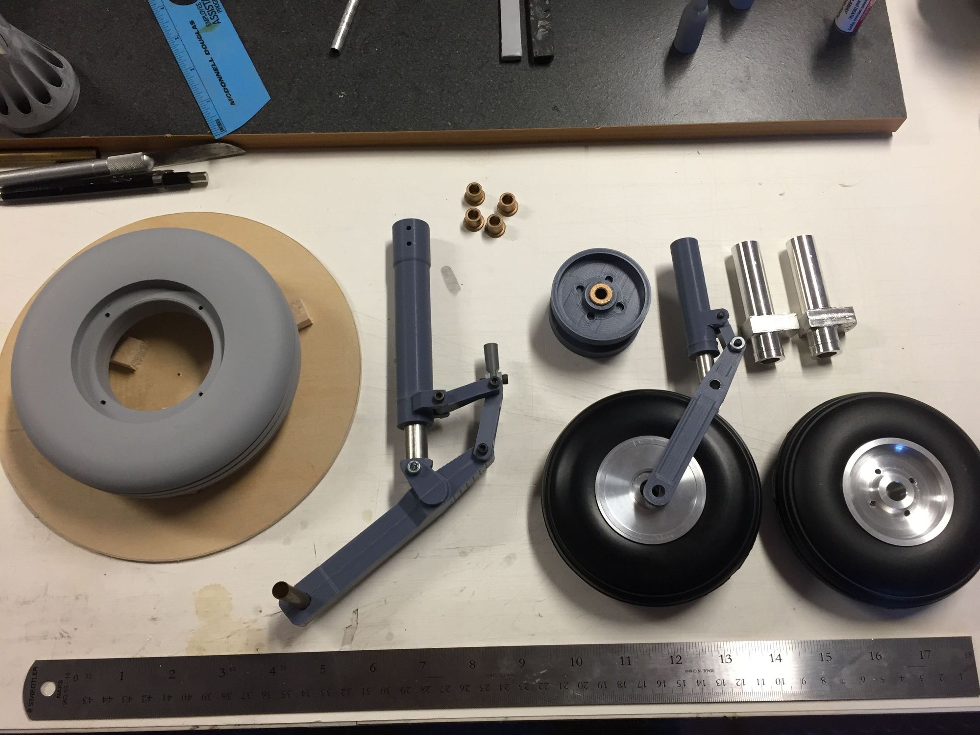 Plastic printed (grown) ABS struts, along with machined rims and the Behotec NLG tire. the plan was to make 2 usable landing gear sets for now.