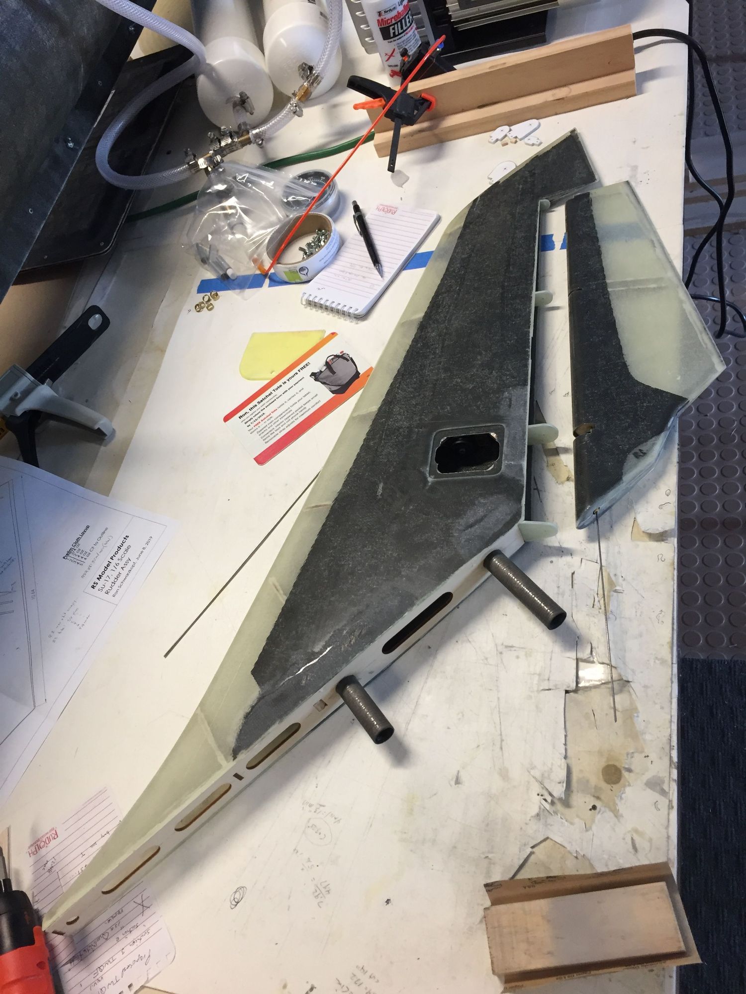 When I laid up the LH Vfin skin, I added a servo cover in the mold. When the skin is laid up and bagged, you'll be left with a skin that has a pocket for a servo cover. So that's what I have here. Also followed same process to lay up the rudder, with separate molds.