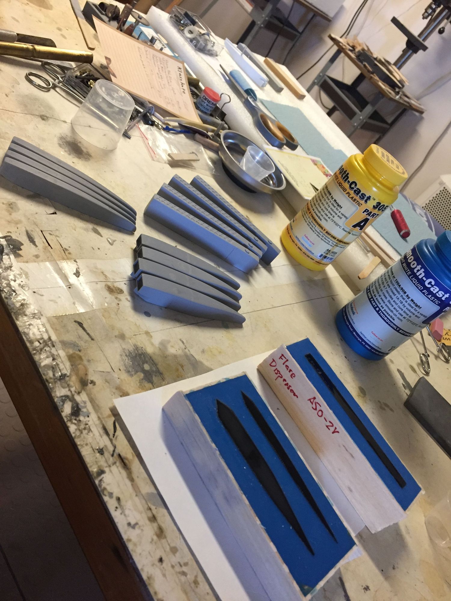 Casting some aft fuselage inlets, then hogging them out on the backside, because they're a bit heavy... Also casting some flare rail launchers, eventually to be mounted on top of the fuselage.