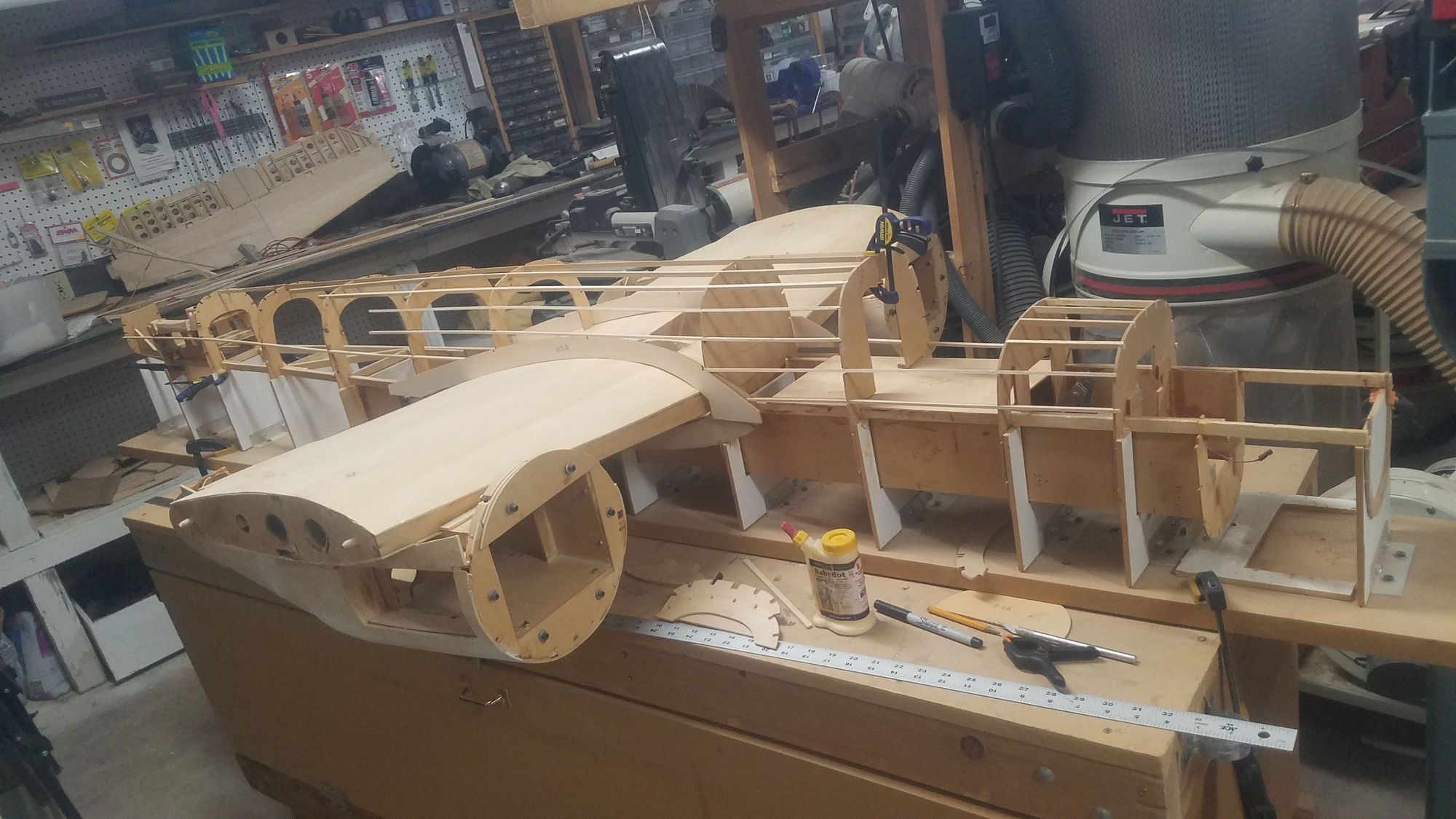 Fuselage in jig with center section. Thank goodness for the jig to keep it straight and true.