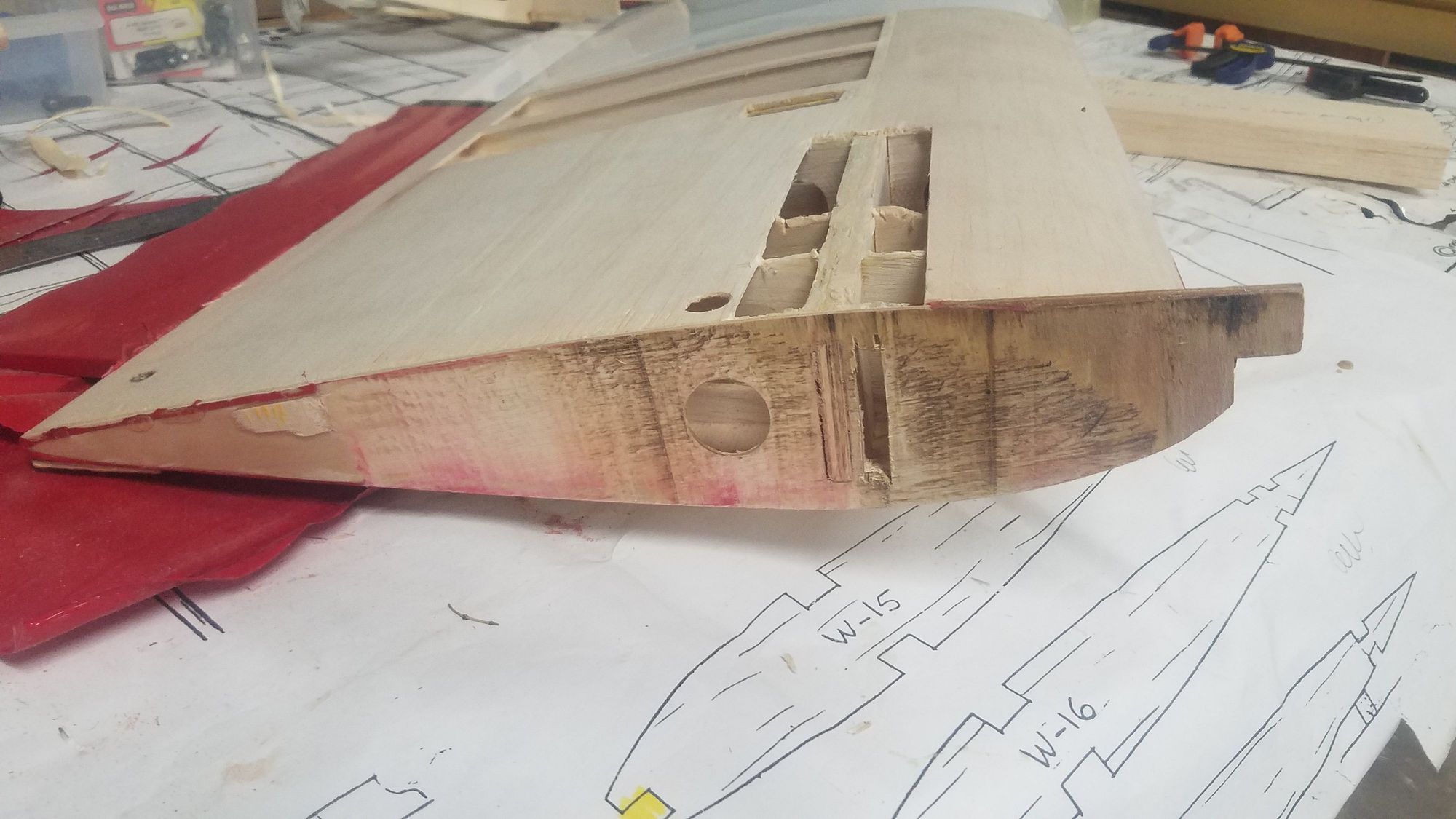 End view of start of cuts for new spars, one on each side of existing main spar.