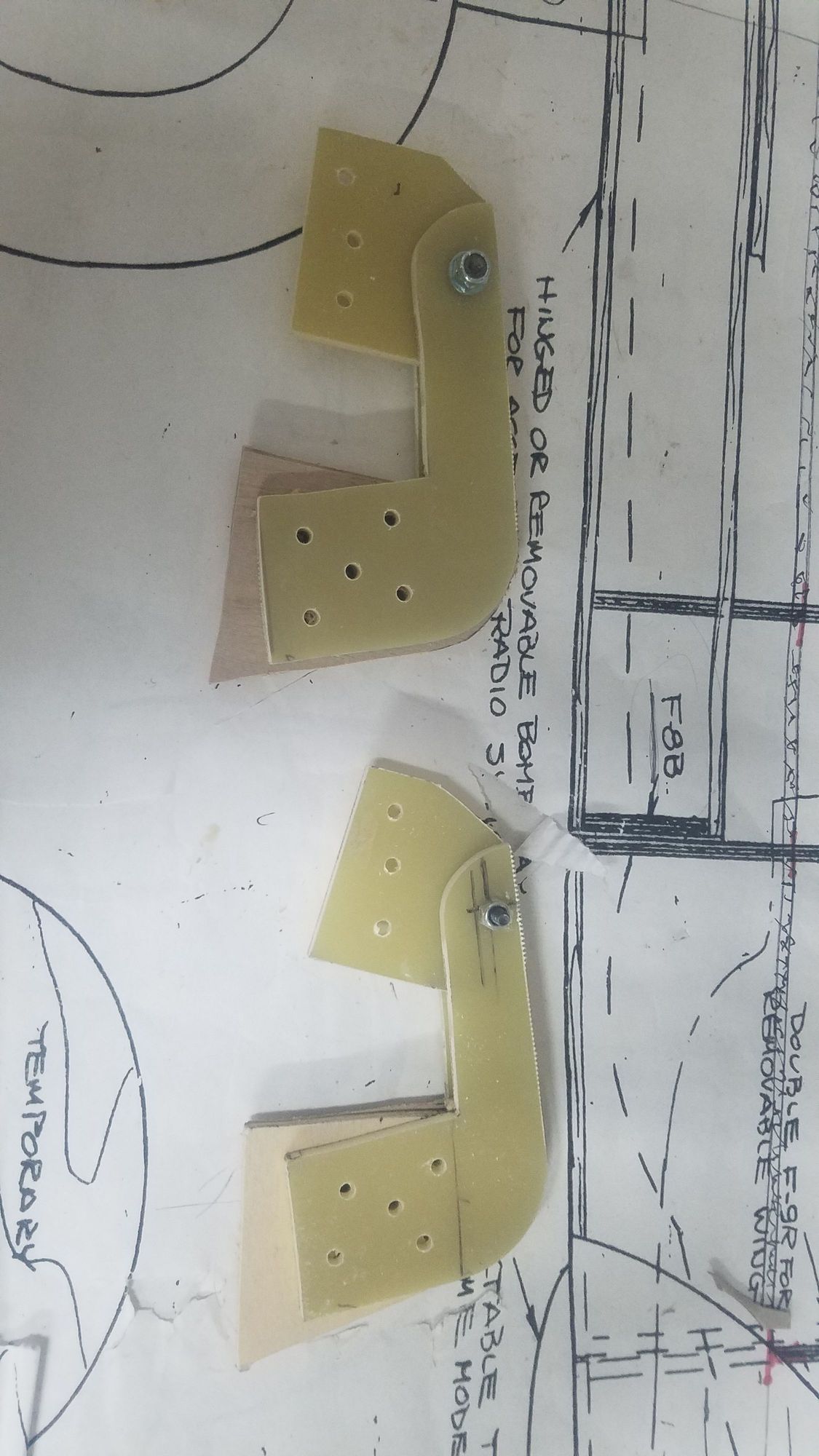 Hinge assembled. Holes drilled for glue and surface scraped for better adhesion. Pivot bolt tightened down to stop rotation and then back off about one half turn to allow easy movement.