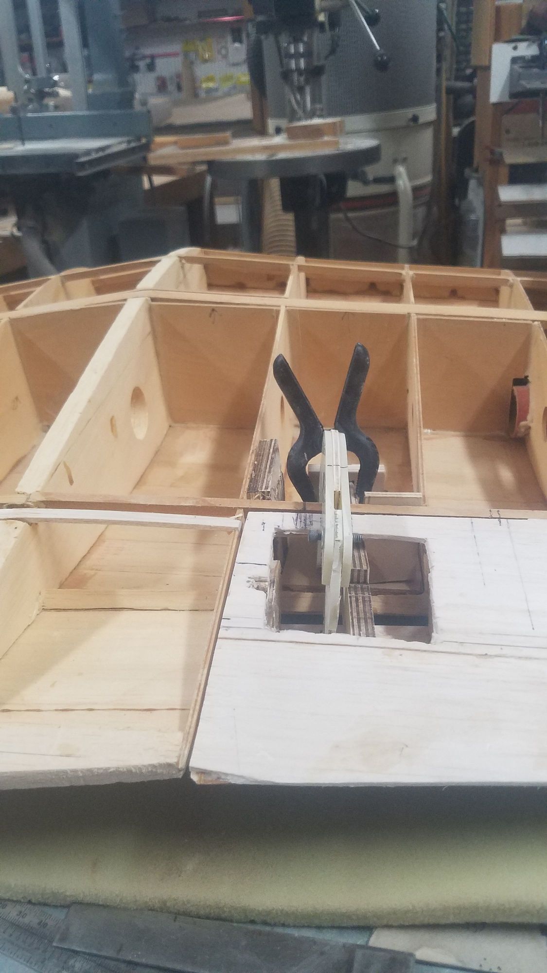 A rear view of hinge clamped in place. I used CA to temporarily set the hinge. Side supports will be epoxied in.