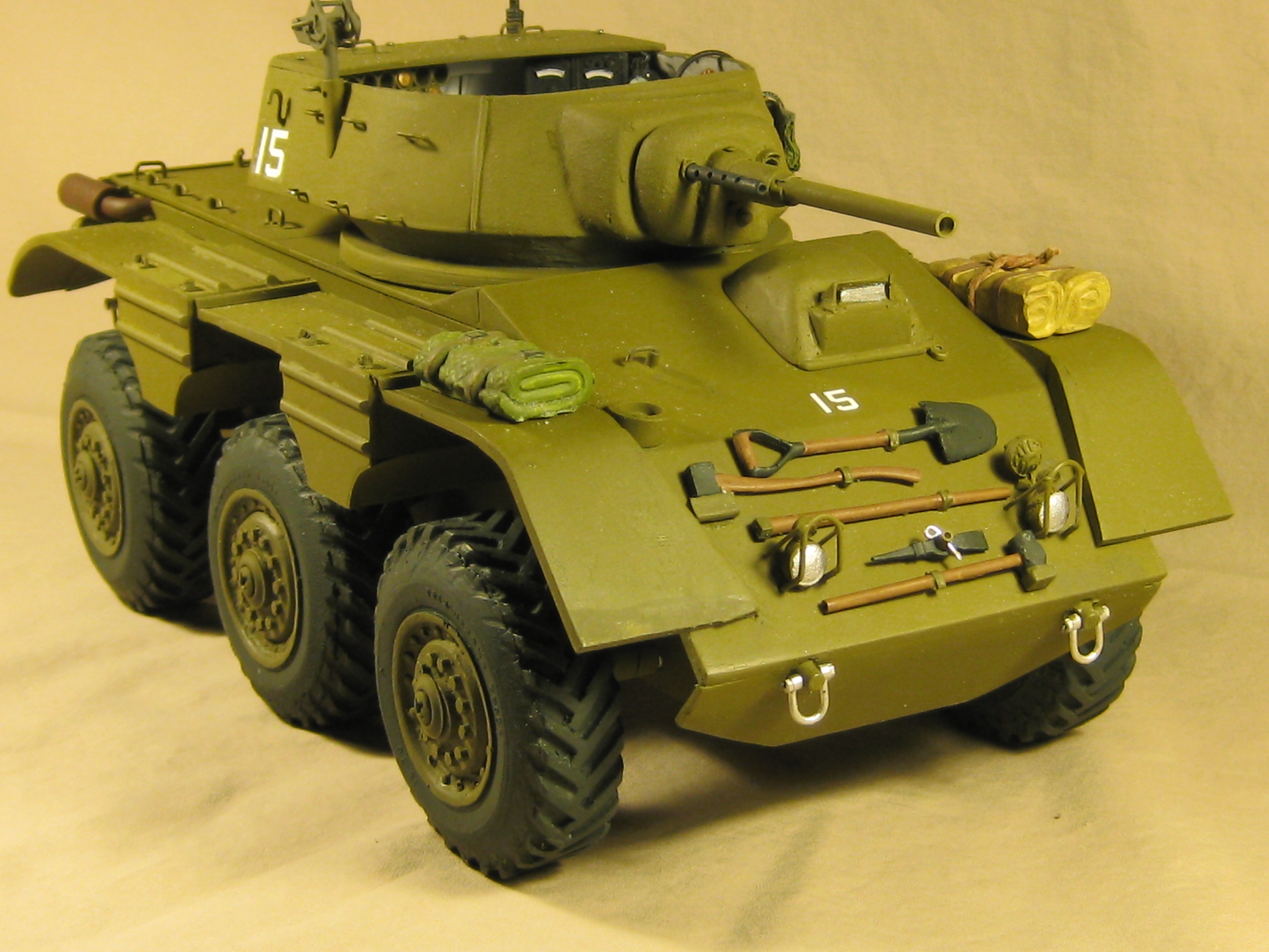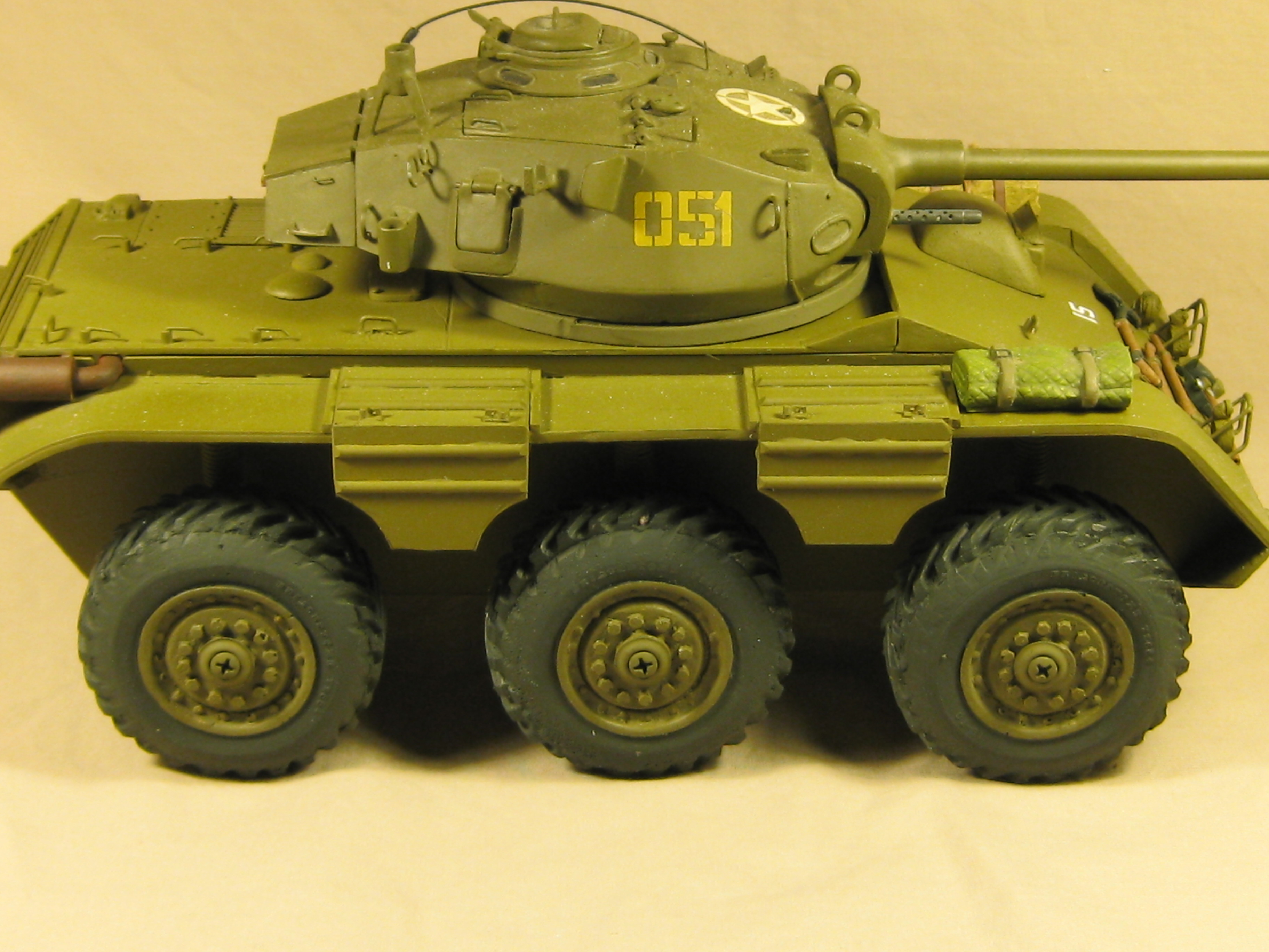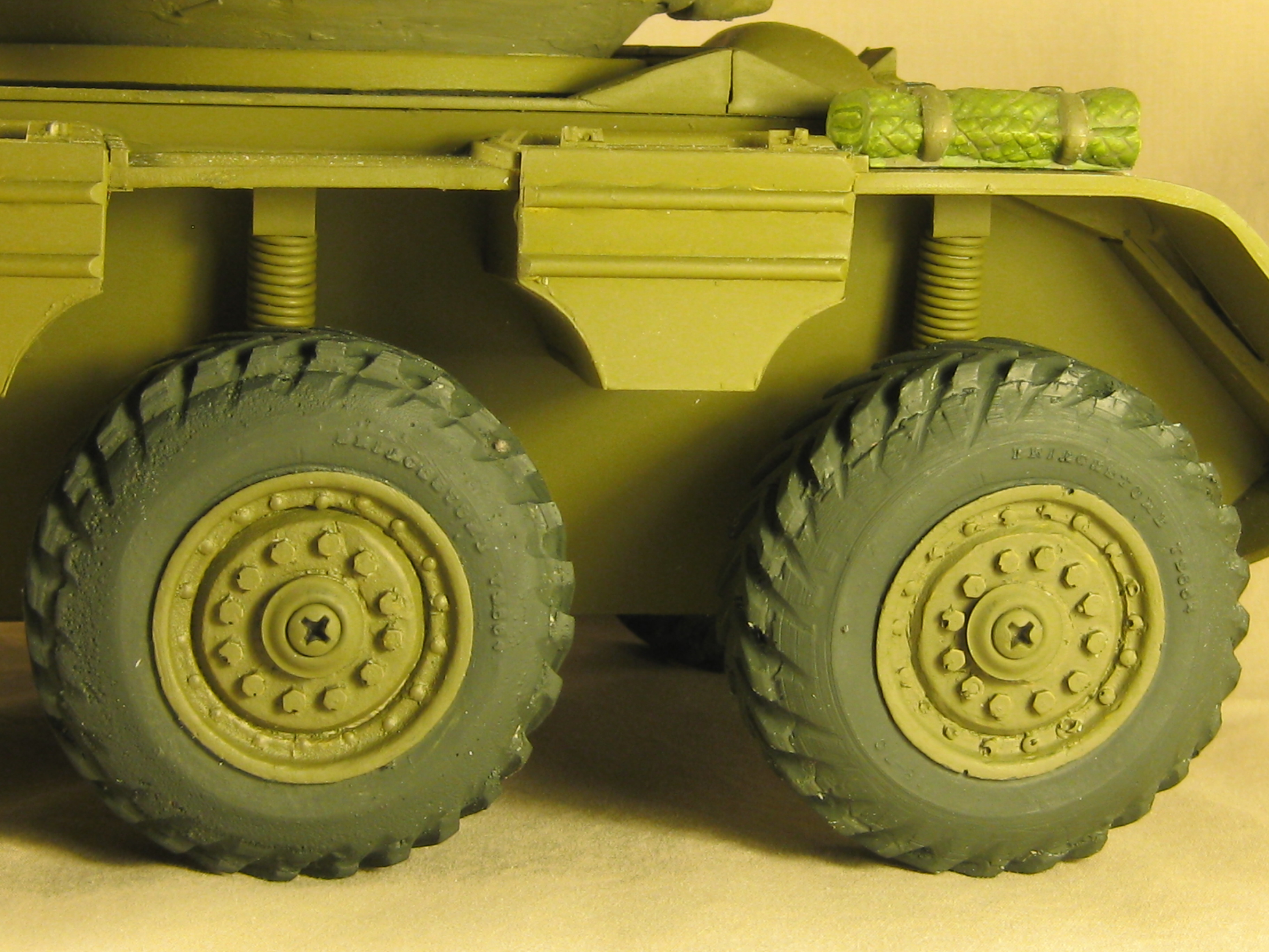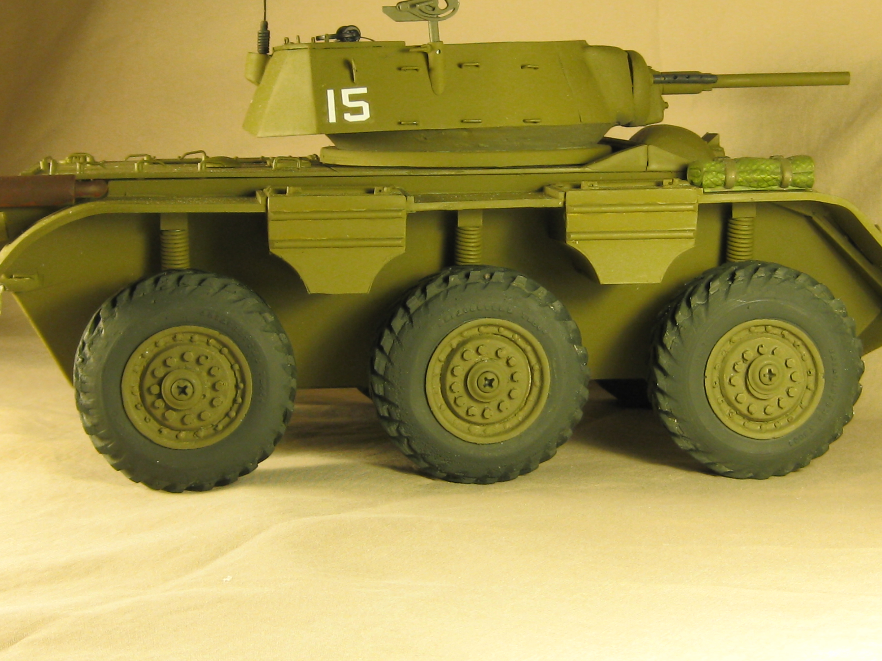 I like armored cars and this one has been on my list for a long time. The T 28 Wolfhound was an experimental job that never went into production. The War Dept. decided the M8 Greyhound was doing a good job and there was no need for another vehicle to fill that need. The prototype also had a Chaffee turret mounted on it, and that one was designated the M 38. Since I already had a Chaffee, I couldn't resist stealing the turret from it for this project. Also, it had the directional cross country combat tires with the chevron tread pattern that I thought was different for a change. My armored car has two interchangeable methods to power it so that it can be driven on the battlefield without fear of R/C failure. You can push it with a stick or pull it with a string -------- none of that complicated R/C stuff is involved that can break down.