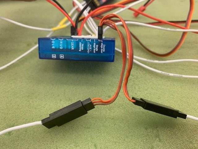 There are multiple ways to hook up the electronics from stock to multiple mods. I wanted to have every flight control on a separate channel for adjustment and mixing. I use a 12 channel Jeti Assist receiver with internal gyro. However I still wanted to use the ribbon cable plugs to the wings to make it easy to attach the wings. And I wanted to bypass the blue box for elevator control and power since it had been flagged as a possible problem. To accomplish this I split off the signal wires from the ribbon cable for flaps and ailerons and main gear doors. The signals come through individual channels but the wing servo and lights power comes from the blue box. In additon I wanted to use the Double Stage Door seequencer but there was only one outlet so I needed a Y for the gear door signal wires.
