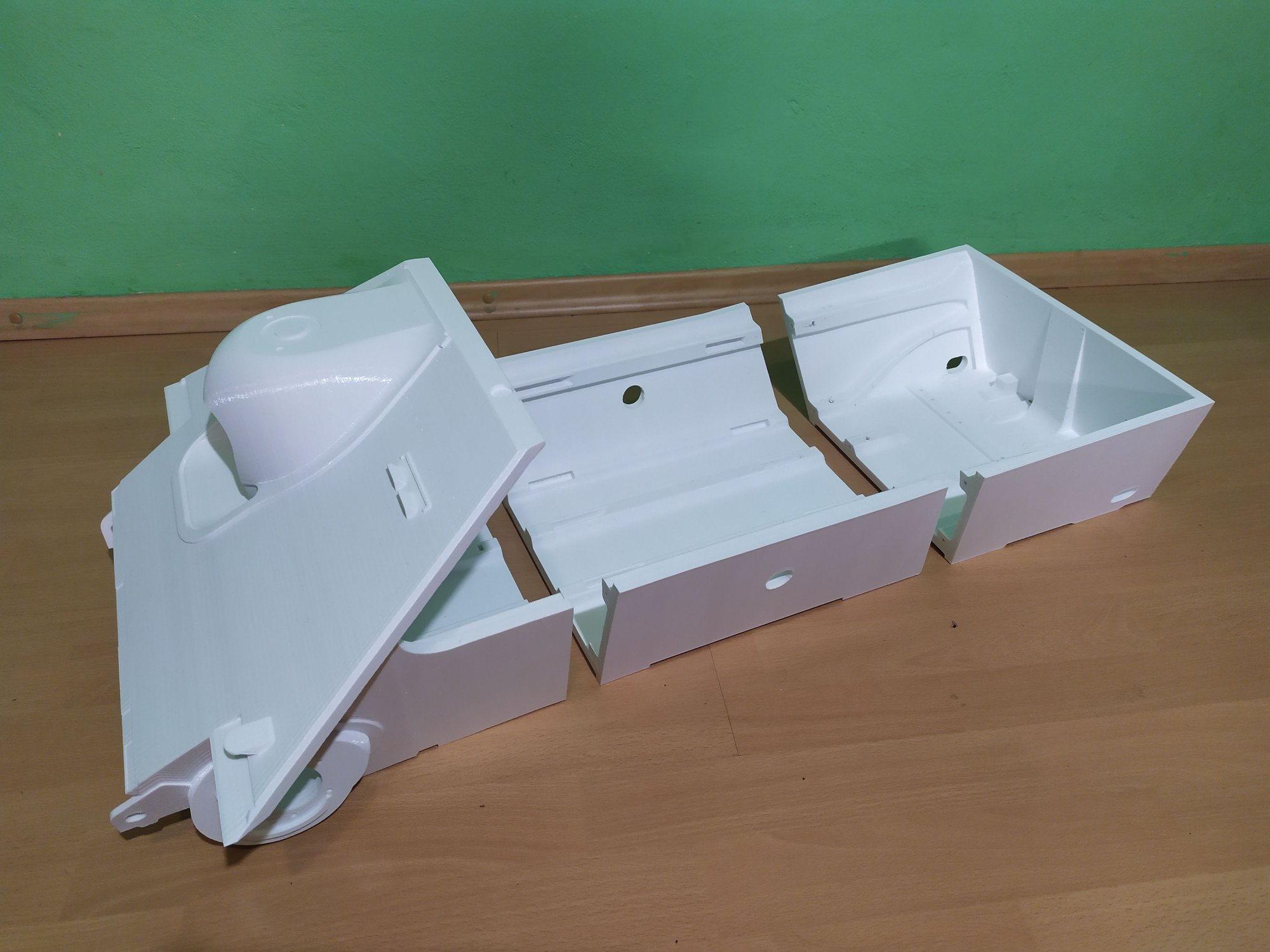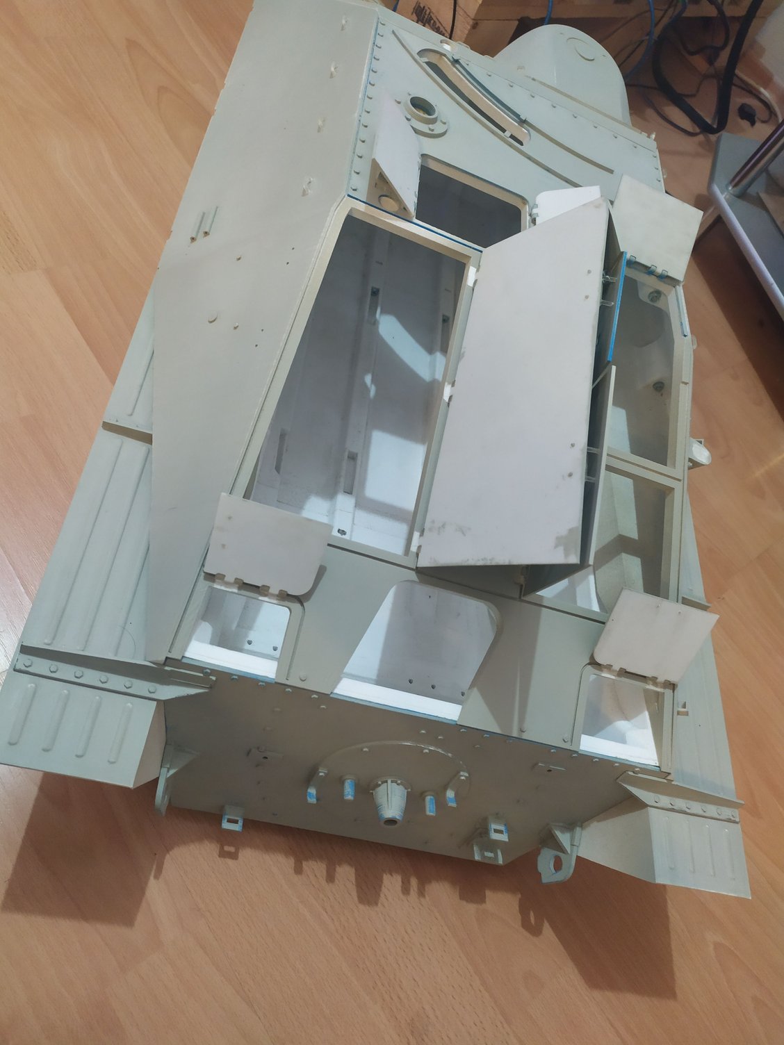 Upper hull.All hatches are openable, of course.You can see groove for shooting periscope.It moves with gun (like 1/16 version, but fully reworked for this new scale).360° MG rotation is a matter of course.