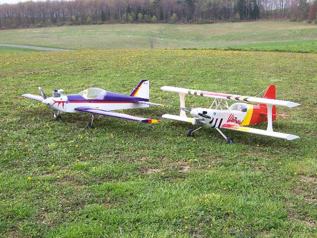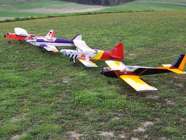 Do I have pictures, ha ha, I have lots of pictures. Here are a few. The homer plane is a GP Ultra Sport, The first pic here is the Ultra Sport with a GP Ultimate. These both belong to a guy at my field, Joe, aka Waldo Pepper. He's been flying and building for over 20 years. Here is a pic of those two between a CG Tiger II and an Eagle, and then last but certainly not least, my UCD on the Dandelion runway before its maiden.