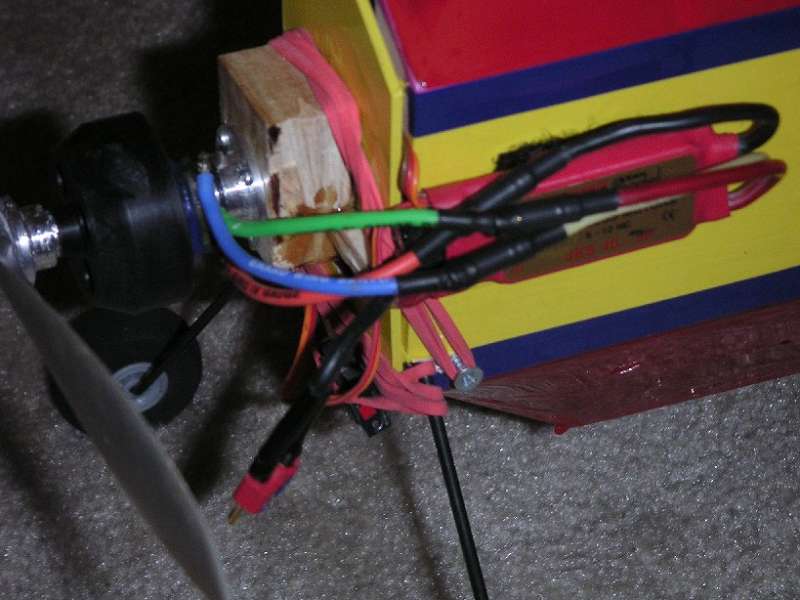 Here is a picture of my motor setup. The battery goes inside the little drawer where the fuel tank was supposed to go. I run the battery lead through a hole in the firewall and connect it to the speed control which is velcro-ed to the outside. I use two rubber bands to secure the drawer. One is looped around the LG, the other around two screws in the LG wood block. I cut down the wooden motor mounts and glued a small piece of pine to the firewall and what was left of the wooden motor mounts. I then screwed my PJS motor mount into that. This provided a more solid base to screw into and also helped move the CG forward slightly.