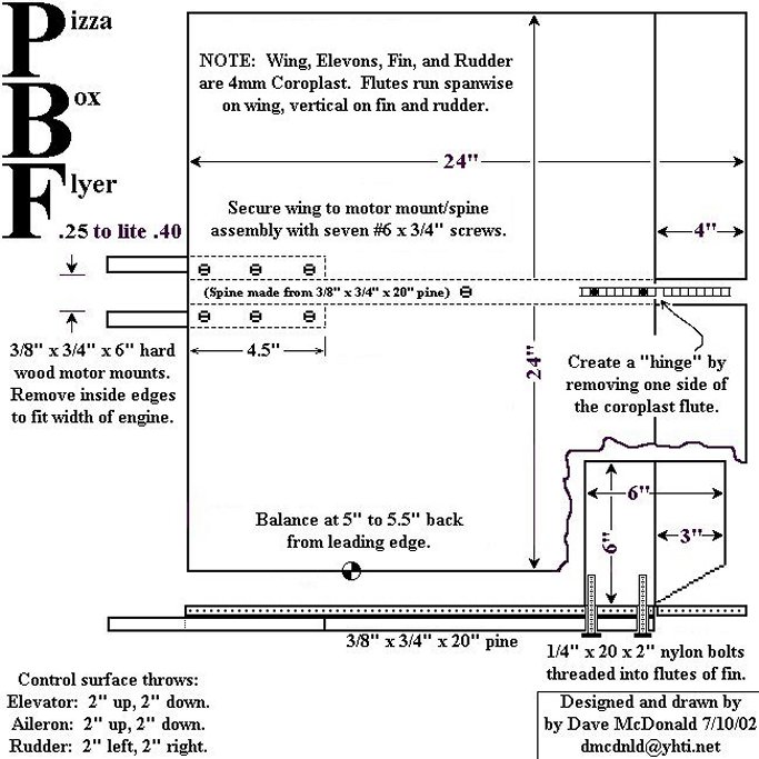 Buy some 24" x 24" of coroplast sheets from www.harborsales.net and get to work with them. Buy a cheap 25-40cc motor with 4 standard servos, 3 12" pushrods, and 1 6" pushrod.