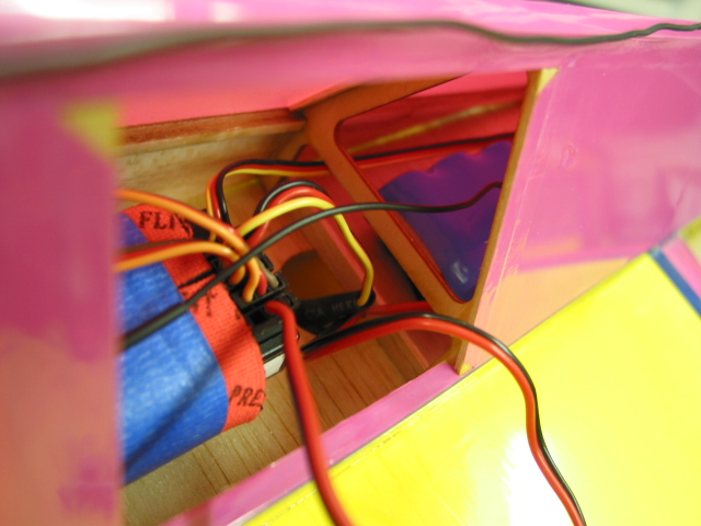 I've gone ahead and moved my receiver back to my rear-wing hatch location as well. I like it much better there. I'm now down to three 12" extensions and one 6" extension. I also took out two small pieces of wood I had added in the nose to form a sort of tray. All in all I've saved over an ounce and moved my C/G back just a little. Even with the stock muffler I'm a good 1"+ back from the spar. I've also swapped out my servo arms as suggested by Going Vert.