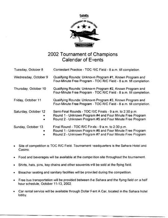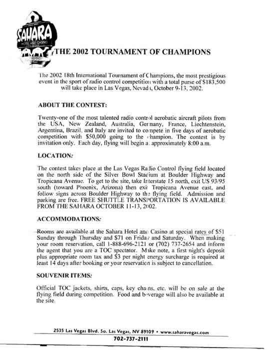 The week of TOC is the first week of my 2 month sabbatical from Intel. I think I will stay at Sam's Town instead of Sahara. Yeeehaw! Since I live in the Phoenix area, I'm gonna drive in case there are some nice RTF planes for sale!