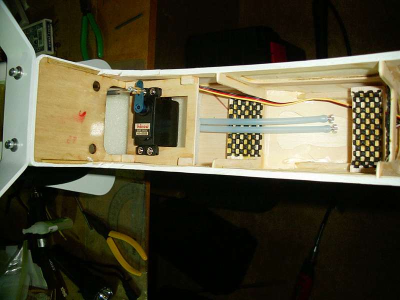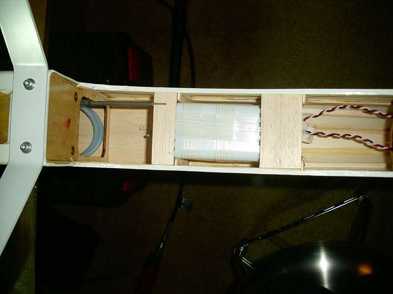OOOPS, I put the throttle servo a little to high and the lingage protrudes above the wing line. I'll have to cut it loose and lower the mount a wee bit. So watch that if you're doing a similar install.