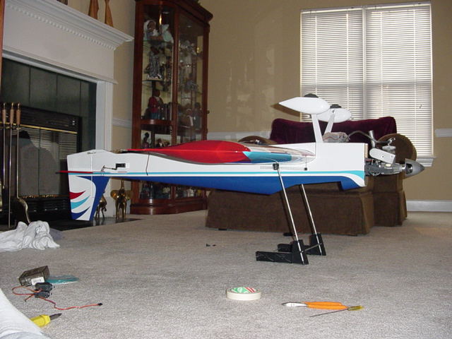 I love to fly this one on an 8oz tank for an easy 15 minutes. it will do the waterfall and t-roll very well. I have never been able to do a blender or elevator with this set up. I am 8 3/4 lbs with a pitts muffler. I am not sure what the weight will be with the tune pipe. I have unlimited verticle. I could never get the RCS 1.4 to have unlimited verticle on the pervious planes (DP ultimate and a DA Funtana). I figured what the heck why not try that baby on this kit. The rCS is right at home on this set up. I am running a 18 x 6W apc that works great! The balance works great by sifting my servos in the rear (3), and the reciever battery. I should be able to use the cowl this time around and it will all hide in that long sucker.