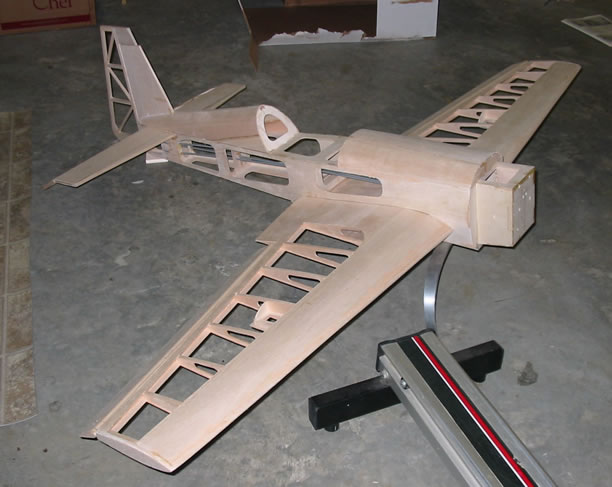 This is my latest project. It is the GP Extra 300 (60 size). I am powering it with and OS 120. My goal is not a 3D machine but a nice IMAC type aircraft. I am hoping that by going with the OS 1.20 I will get truly unlimited performance. I built it mostly stock other that increased sizes of the Elevator halves and Rudder. This is a picture before I Covered the tail. If I have time tommorow I will take a new picture of the plane with the tail covered and the cowl mounted.