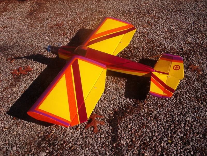 His simple, light building techniques yield a very, very light, competitive, 78" long airplane that weighs 7lbs. 4oz. ready to fly! The original powered with an OS91fx, a new version powered with a YS110, and now an electric version flying with a Plettenburg outrunner (insane quiet power) are amazing to watch. Troy Newman borrowed Mr. Penton's electric version and took 1st place in FAI at a pattern contest in Houston, TX. The YS110 version was present as well. What happened after the contest was over really showed the capabilities of the design. Screwing around as it could be called, the two Express' planes performed amazingly tight, smooth, and precise knife edge square loops. In a stiff headwind after the contest on Sunday, one of the Express' held itself stationary over the runway in Knife Edge...then, the young, gifted pilot (Brett Wickizer) performed a positive snap back to it stationary position...then a negative snap...then a positive, negative, positive..you get the idea.