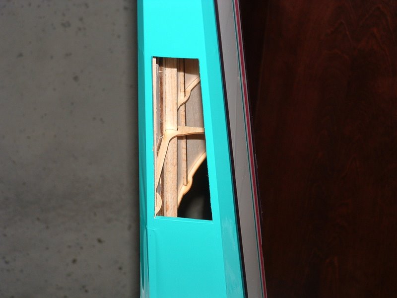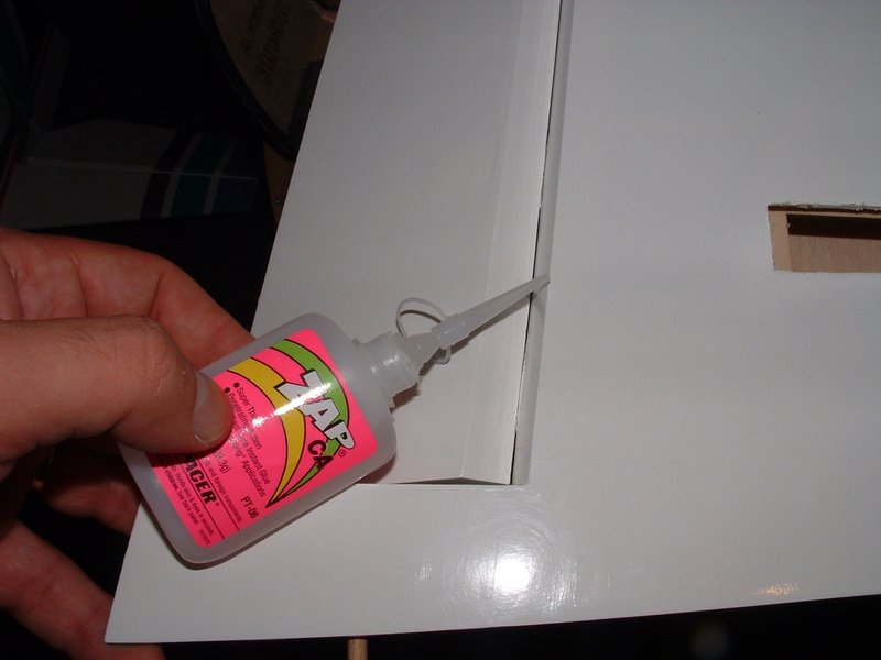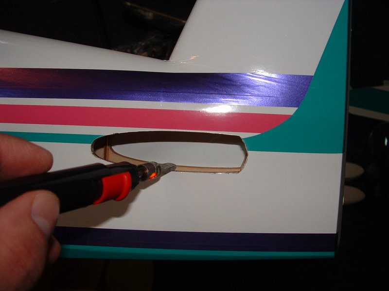 First, make a servo tray from ply. Trace the opening from the servo tray on the plane and use a sharp #11 blade to cut it out. Getting the servo tray into place can be tricky. However, using the air exit hole we made earlier, will simplify things. Simply go in through the bottom and once satisfied with the plate postion on the inside of the fuse, wick thin CA both through the fuse and from the hole you made.