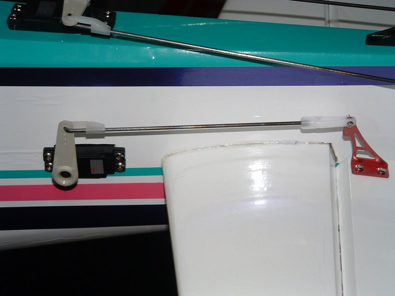 The Rudder Servo is mounted in the rear bottom of the fuse. The JR sport 125 is a standard servo, so no alterations were needed. Two aluminum control horns are used for the rudder. It is set up as a pull pull, however using control rods instead of cable. It works very well and plenty of throw is acheived.