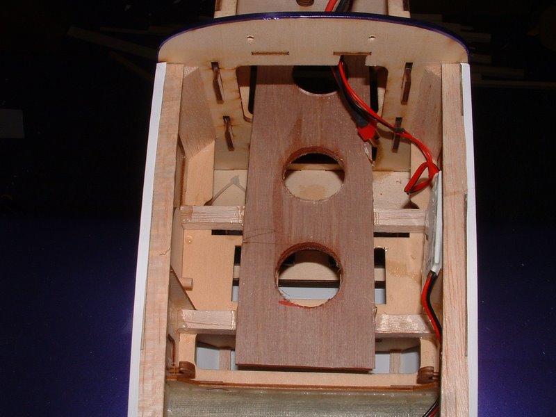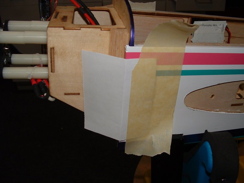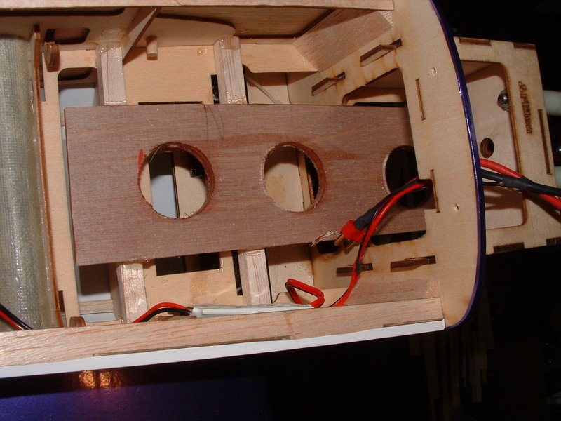 The battery tray is comprised of nothing more than 1/8" balsa laminated with 1/64th lite ply. It makes a very strong plate and has never failed me. I drilled some holes to allow cooling air to rise through the plate to contact the bottom of the batteries. Some velcro on the plate mates with the loop velcro on the batteries and keeps them from shifting laterally. A velcro seat belt is used around the tray and batteries to ensure they stay put during high G maneuvers. My batteries rest directly against the firewall and put my CG right at the recommended rearward location. I have plenty of room to shift them into the motor box if necessary, however this means shaving away some material of the firewall to slide them foward. I am hoping that it will not be necessary.