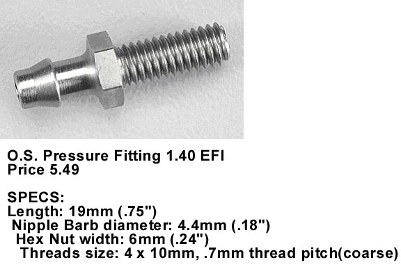 The pictures show where I mounted Perry VP-30 pumps on a Giles and a Katana. One picture shows that the rear of the Giles' fuel tank extends well behind the wing tube. The remaining picture shows the O.S. 1.40 EFI pressure fitting that I use in my I.60 engines. The Perry pump comes with a little pressure fitting that you may find easier to install because you drill and tap the crankcase cover for it.