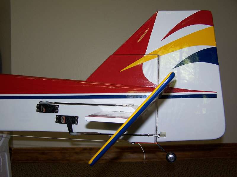 Evil, I am getting a decent amount of travel. As near as I can measure I'm getting 45 degree deflection up and down. With the Dubro hinges I have zero binding. I'm pretty pleased with the way that came out. I think the horn length on the elevators is 1 1/8" and 1 1/4" on the rudder. The rudder will touch the elevator on maximum deflection.Spud, Heck of a good idea. Thanks. I'll put the rubber tube on the tailwheel wire and loop my antana through it and won't have that ugly dangling thing.