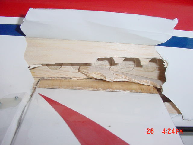 I flew it straight up, cut the throttle to idle and let is spin. About 1/2 down there was a violent flutter. I immedately landed. The first thing I noticed was the 4/40 control rod I use on the Aileron was really bent. I loaded up the plane and went home. I haven't taken off the monokote yet but I can feel the cracks in the balsa wood on the leading edge of the wing. My failure occured on the left side of the wing leading edge between where the sevo mounts and the fuselage. Did yours fail there too? Do you think great planes will back this failure?