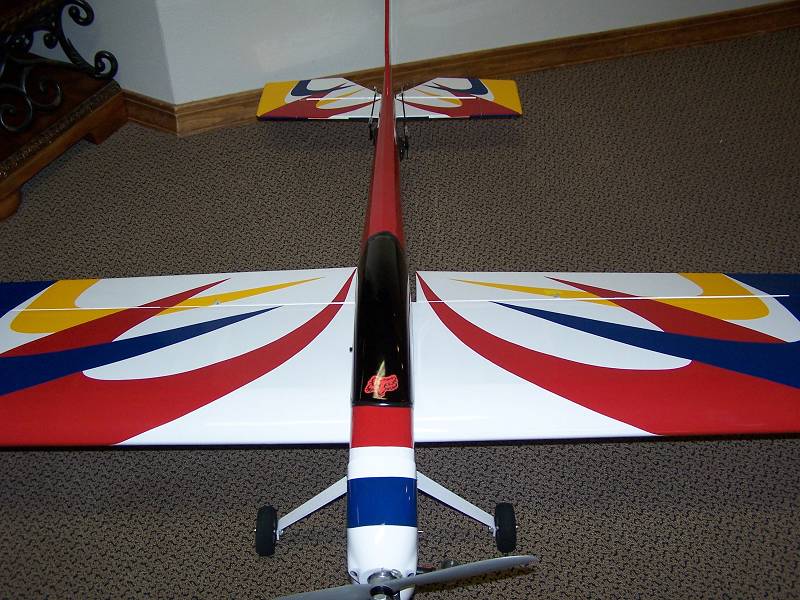 Got my 46 done tonight!!!! I just did the AUW on it: 5lbs 14ozs. Before I crashed it, it weighed 5lbs 12.5ozs. I'm very please with that. Either that or I didn't use enough glue and blasa for the repair. Guess we'll see. But I used CA only and put in the same parts, spar for spar etc. My CG went back to 5 3/4" from 5 5/8". I put everything, battery, receiver, servos etc back in the same place. But I should be ok at 5 3/4" Aren't some of you guys running your CG there?I've inspected the plane everyway I know how. It looks as straight as a new one. The incidences are the same as near as I can tell. I'm pretty happy with the repair. And basically no cost...well if you don't count the new Saito 82. I put the Saito on the bench and test run it for 60 minutes. Now I've got it in the plane ready to go. With the 14x4W prop I was able to turn 10200 RPM with my 30% fuel. Not to bad.