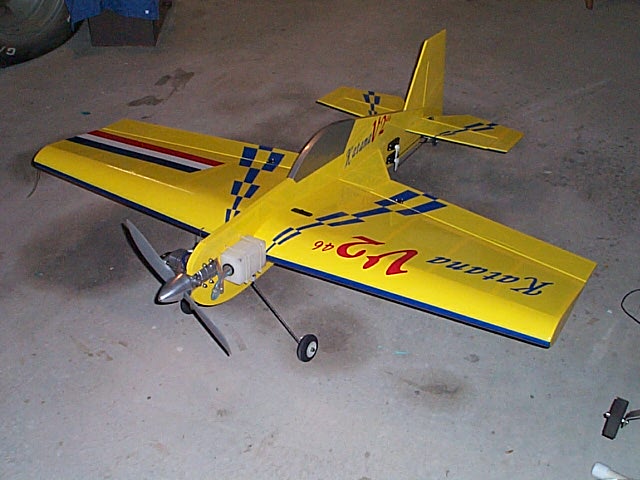 Me: Well, I crashed my Model Tech Extra, damn. Ran into a telephone pole (stupid) and did HER in, but I needed the receiver anyway--and the well run in .45 SuperTigre--which I trust--and which has impressed me with a 12.25 x 3.75 prop, perfect for the Katana, I'm thinking. I'll start with that, anyway. The new ST .51 won't be in until next week, but the footprint is the same--and the weight is ALMOST the same, so I can change it out if I wish.