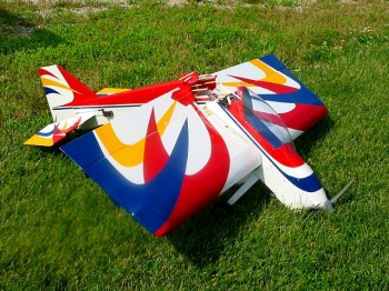 I tried to reverse them on the radio while keeping it in the air but soon gave up on that. Decided to try and land and that ended in a knife edge loop, on the runway. The wingtips sure are tough but unfortunately the fuse broke completely in half behind the canopy.