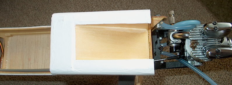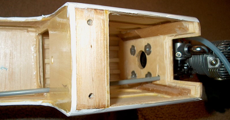 Here's an update on the build so far........ I was able to route the throttle linkage, set the fuel tank, beef up the landing gear block, and install the cowl since I had taken off the "ramp" in the forward fuse. Thanks to Kokamo's advice about omitting the blocks for the cowl it saved quite a bit of time and almost 1/2 oz. of weight. I positioned the screws more toward the aft edge of the cowl and you can see from the second picture there is corner braces aft of the firewall that the screws go into so the blocks really aren't needed. Thanks again Kokamo. Genius idea.[8D] Be carefull to drill the cowl screws in that area if you have the fuel tank in there.....[X(]