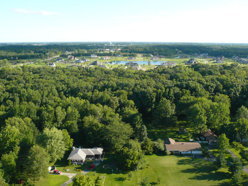 The two pictures below show the converted Draganflyer and a camera shot made with it from 200 feet using a custom camera mount discussed here: