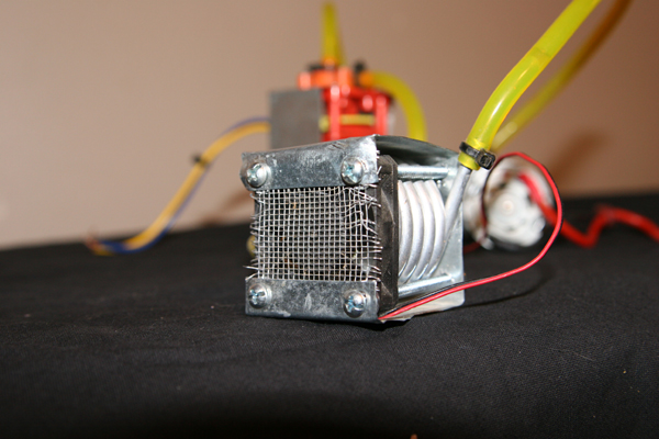 Here are photos of the one i ran in my Exceed RC truck.............................the "radiator" is a traxxas villain cooling tube fit into a Metal flashing housing with a 12v fan on the front. The cooling tube was stretched out just a bit to allow the cool air to pass thru the tubes. The pump is from a weed killer electric wand i found layin around. It worked just as i had thought....it just seemed like too much "stuff" in there, so i went to a 600 motor(runs cooler) and big heat sink. I'm like you, i love to create things and try them. im sure it cooled the motor fine but how much speed, performance etc.... was i really gaining?? By the way, it doesnt weigh anything really............aluminum colling tubes, aluminum roof flashing for the radiator housing, plastic tube and a light little pump. I ran it with 50/50 water to auto coolant.......................seemed like i had to bleed it more than i cared to. Now it just lays in my drawer and my daughter bashes the Exceed truck with the 600 motor, Tekin rebel esc, and 10 cell 4500 nimh(faaaast), with no cooling issues.