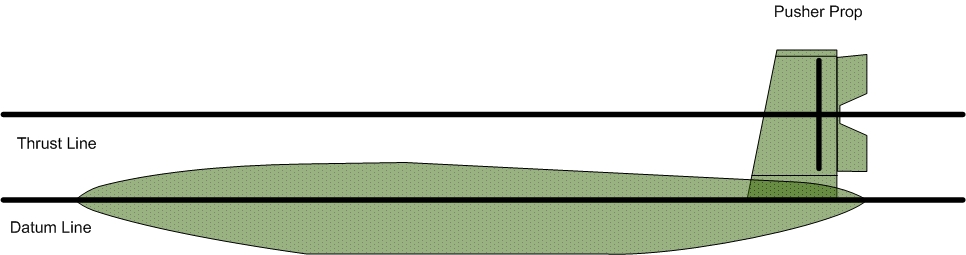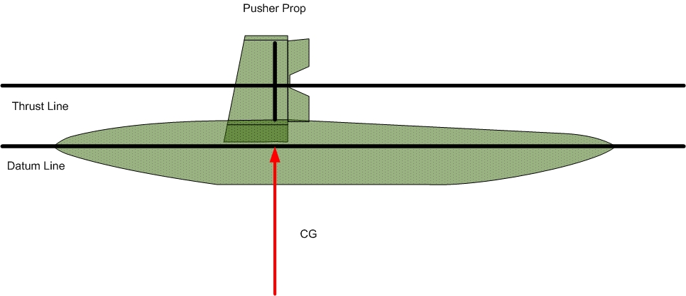 Hypothetically this is a 25 - 30 lb plane. The pusher engine develops maybe 19 lb of thrust. Generally speaking, what is the affect of having the thrust line well above (9"maybe)above the datum line? Assume that the wing, stab, datum and thrust line have the same incidence.