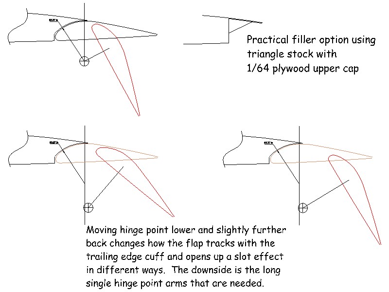 For flaps you might want to consider a simple slotted flap setup as shown in the second sketch. This would use scissors style hinges made from metal or something like G10 fiberglass board or heavy duty Robart Giant Scale hinge pins partially inserted so the hinging occurs below the wing. A discussion on flaps like this on another forum has posts from someone that is flying a model with such flaps. He reports that they are very effective. So much so that if used at more than 45 to 50° during a landing approach that he has to add some power to avoid the model flying so slowly that the controls become too mushy and ineffective. And it should not take a whole lot do include them as shown by the upper right option.