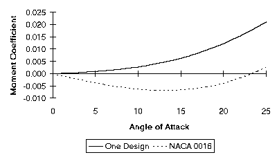 The NACA airfoil has the max thickness at 30% while the "one design" has it at 20%. As you can see the moment coefficient is positive and keeps increasing as the AOA increases while the "one design" coefficient goes negative until it reaches 14 degrees. Adding this pitching moment to a 3D model which tends towards neutral stability can bring it towards the negative stability region.