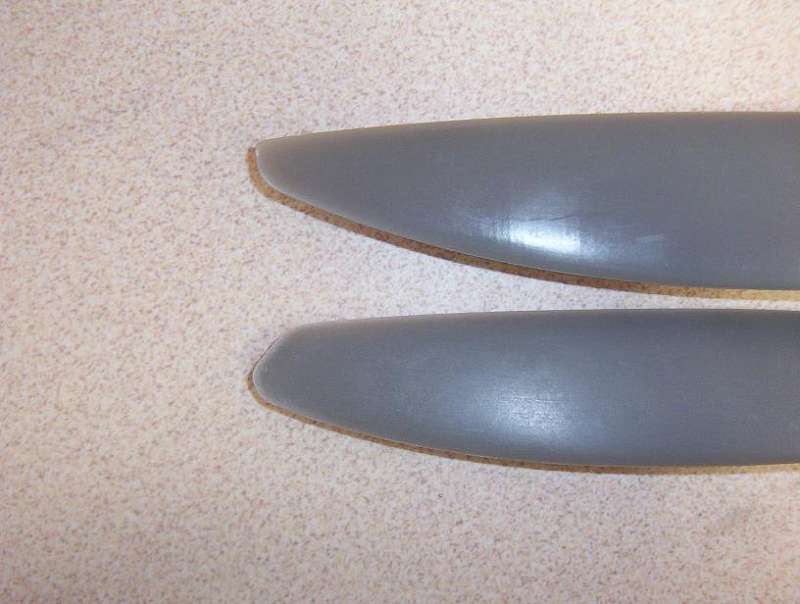 I have a 15 x 6 apc that I had to take 1/2" off the ends of to clean up a chip out. I wanted to keep as much as the prop as I could so, I changed the shape. The leading edge now is larger diameter than trailing edge. Will this be o.k.? Stupid question...Why is it alway the other way? What am I giving up. Please see uploaded picture. The top prop is 18 x 6 not modified and the bottom prop is my hack job.