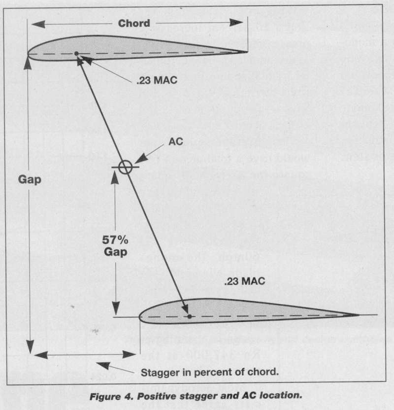 csisfun, yes that is the normal arrangement, called positive stagger. If the upper wing were aft of the lower wing, it is called negative stagger. Depending a lot on other factors in the design, I have found that most model bipes fly best with the upper wing (with positive stagger) incidence at about 1.5 degrees less angle of incidence than the lower. This is not always true as there are other factors involved but; on the Phaetons, Lazy Aces, Aeromasters that I have flown, all flew best with that arrangement. Now, if you were wanting highest efficiency and least drag at cruise, you might find quite a different arrangement gives better results.