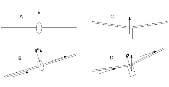I think this is where all the disagreement is coming from. You say that an airplane can be banked and still be flying symetrically. I say when you bank an airplane it is NOT flying symetrically. If you bank you side slip. The only way a banked airplane will not side slip is if you are in a coordinated turn. And if you side slip with dihedral the model will level itself. Some of this will come from the projected planform of the lower wing being longer but the major part will come from the changes in AoA for the two wings as in D in the diagram.