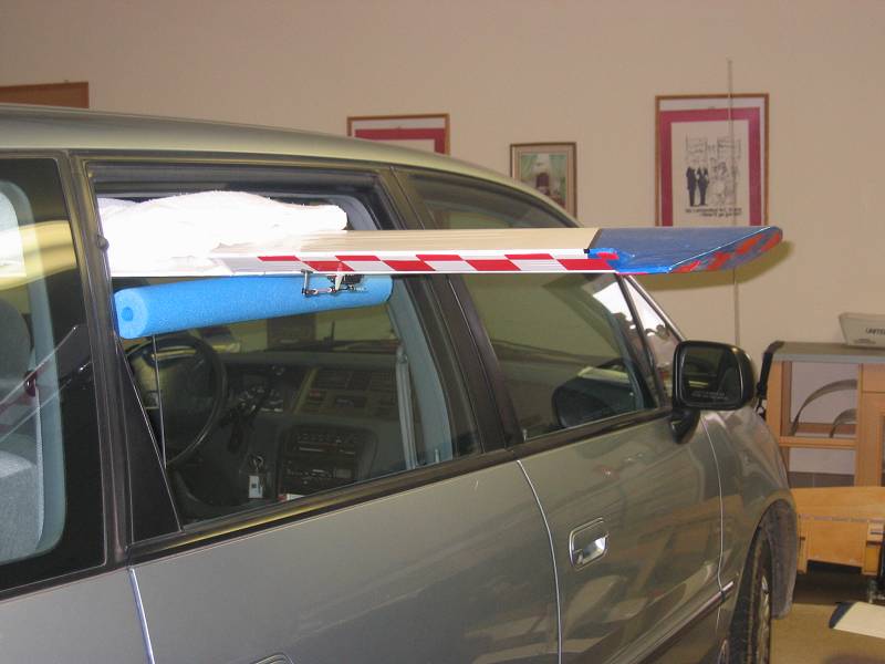 The wing will fit inside the van. It sticks out about 30β to the right and can be held in place by the windows. The servo leads are inside the van and an extra RX is available.