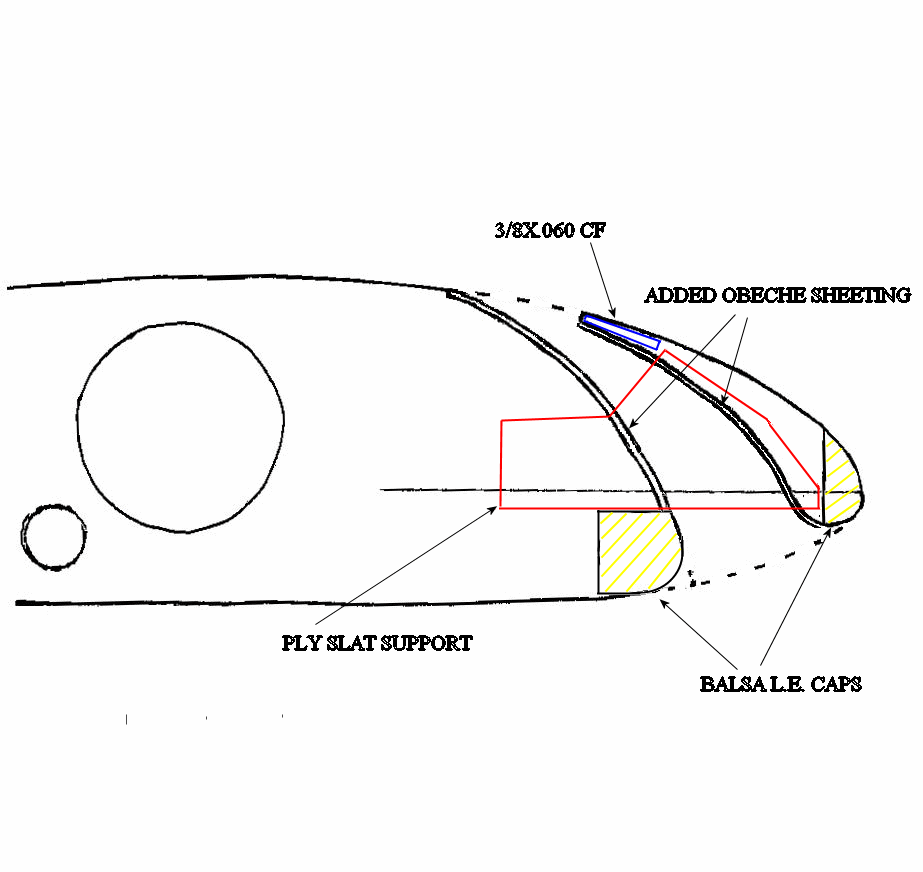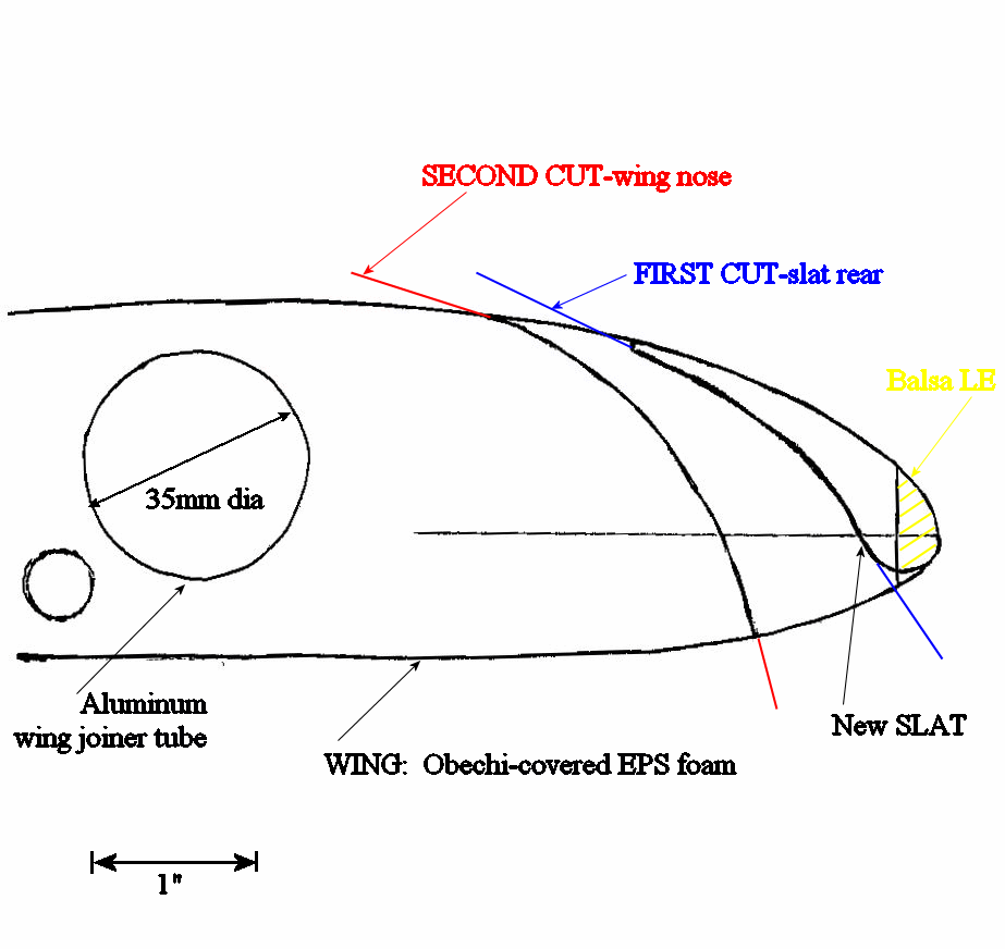 It would be easy to add the fixed slats to the model wing. Attached is a drawing based on a traced outline of the modeled wing. I think that I can carefully cut the obeche sheeting and with a hot-wire cutter cut the "rear edge" of the slat (with the LE balsa cap previously attached), and then secondly cut the new "nose" of the wing panel. I would make root-and-tip templates for each operation. After cutting, I would add proper reinforcements and obeche (or balsa) sheeting to the cut areas of the new slats and wing panels, along with ply standoffs to mount the slats to the wing.
