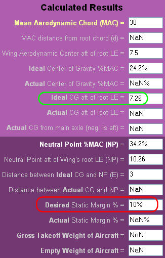 The red circle shows you input a Static Margin of 10%. It shows in the green circle that the CG for that SM would be 7.26 back from the LE of the wing.
