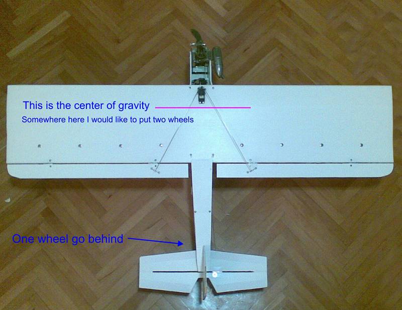 Mike's recomendation works great on a very smooth golf green like strip or on a paved strip. For lumpy grass fields I like to double the distance. On narrow winged designs this generally means the axle is at the leading edge. On wider wings like this one the axle would be more like at around the 10% chord point. Putting the axle much closer results in a higher percentage of nose over landing rolls.