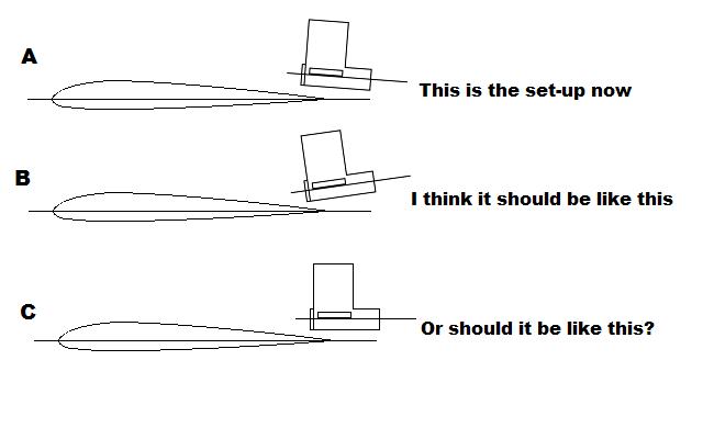 Diagram A) The airframe out of the box has several degrees of engine down thrust. Being a top mounted engine I'm of the understanding that any thrust above the wing will try to push the nose down anyway so I really don't think it needs any more down thrust.
