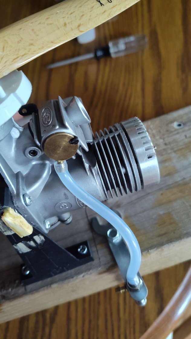 I have two lines in the 12oz. Sullivan tank. One is for the klunk that goes to the bottom of the tank and the other is the vent that points up into the nipple as per the directions. I did double check the lines if I had them backwards and they are correct. I have the tank mounted as close to the motor as I can so my lines are not too long. There is a hose from the nipple on the muffler going to the vent line in the tank. The klunk line goes to my fuel adjusted valve then a hose from the valve to the carb. I have taken a separate hose connected to the fuel valve and blew air as I opened it, I could feel less resistance the more I opened it up. The same for the carb. More air I could blow through the more the more the throttle opened.