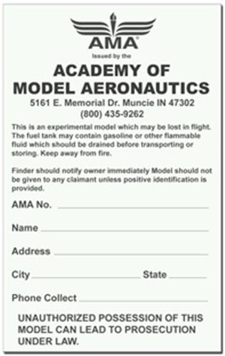 Anyone who built a Sig or Carl Goldberg kit , as well as other manufacturer's kits as well , surely must have run into this sticker at least once or twice while poking around in the box of wood waiting for the glue to dry on step one . Figuring it was put there by , or at least put their on the behalf of , the AMA , I always dutifully filled it out and stuck it just inside whatever removable access hatch the model had , figuring that sticker satisfied the "on or in" identification requirement and thus kept my AMA insurance in effect by not violating the safety code . I used to go the extra measure of having my AMA number on the wings but stopped that in favor of just having that sticker , and of course now the FAA number , stuck on with a "P touch" label maker .