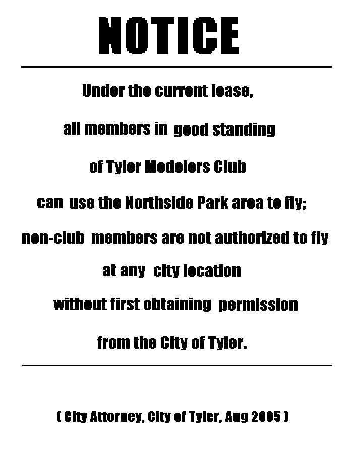 It also appears that the lease does include a clause that prohibits those within 50 miles from flying without membership or a permit. Model flying is generally prohibited in the parks of Tyler. It would appear that the club got caught in a catch 22 over the sanctioned events.