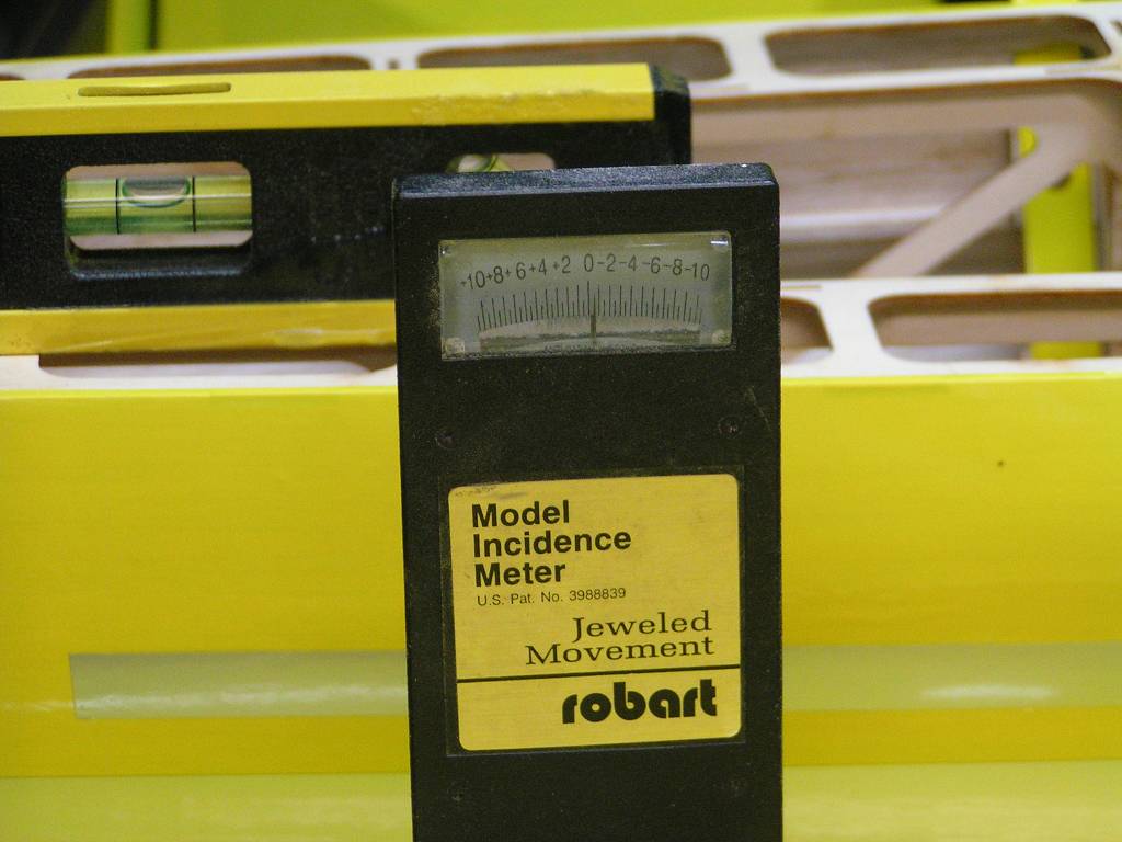 I squared up the stab to the fuse with a "T" pin and string, then leveled the fuse and put the incidence meter on the stab. Bingo, the stab was at "0", had a little smile on my face.. So I put on the bottom wings and checked them to the stab and was shocked that they were right on the money, bigger smile! I re leveled the fuse checked the stab and it was still right at "0", so I put the meter on the wing.. It is so close to "0" I'm not messing with it, best I can tell it was at .25 of a degree, if that... More then satisfied with those numbers, going to glue the stab and fin in later tonight after football practice and get some servos mounted in the tail...